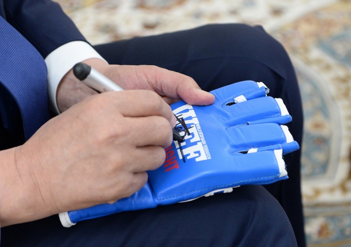 Мамлекет башчысы меймандарды жылуу кабыл алып, Валентинаны жеңиши менен жана аялдардын эң жеңил салмагында чемпиондук курду жеңип алышы менен куттуктады.